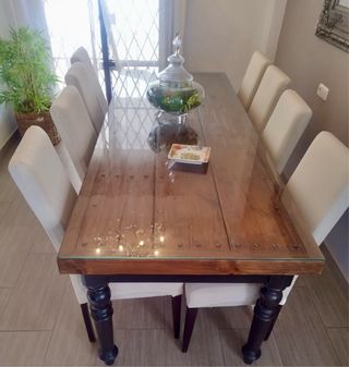 Mesa elegante para recibidor o comedor hecha con una puerta antigua. Mesa única y original. En perfecto estado. Mesa maciza y duradera. Estructura de caoba y base hecha con el antiguo portón de un edificio. Con capacidad para 8 a 10 comensales. Medidas de 2,32 x 0,92 x 0,81. Incluye cristal reforzado de 20 mm. Regalo 8 sillas con sus fundas.