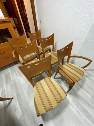 Conjunto de mesa de comedor de madera maciza con seis sillas a juego, está en buen estado menos lo que es la base de arriba que habría que lijarla y barnizarla ya que tiene desperfectos de uso que muestro en las fotos, el traslado por cuenta del comprador - Mesa extensible para diez comensales - Seis sillas tapizadas el año pasado