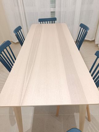 Mesa de comedor grande LISABO de IKEA, con un diseño moderno y patas cónicas. En perfecto estado. Casi no se ha usado. Es muy bonita, clara y dio muy buen resultado. Las sillas no están en venta. Solo se venderían conjuntamente con la mesa por una cantidad de dinero adicional. Laa mesa solo se vende por 160€. Solo entregas en Santiago de Compostela y alrededores. - Tablero de madera clara con bordes redondeados. - Patas de madera robustas y estables. - Amplia superficie de 200x78 cm. Obviamente caben más sillas alrededor, pero nosotros solo tenemos seis.