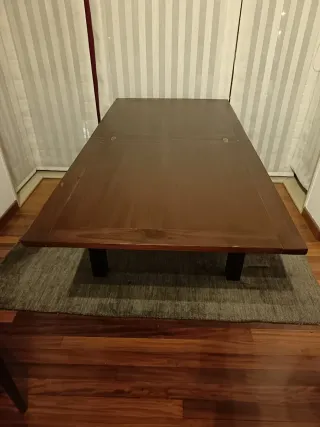 Mesa de madera con cuatro sillas tambien de madera. La mesa mide 135x81 cm. La mesa se abre por los dos lados hasta los 207 cm. Los lados que abren no son de madera son de contrachapado y uno de ellos esta tocado(ver fotos). Esta en Vilaboa-A Coruña.