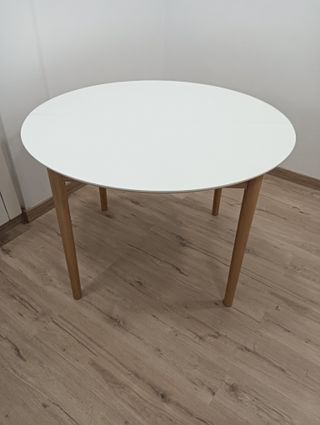 Mesa de comedor redonda con un diámetro de 110 cm. Su diseño moderno se adapta a cualquier espacio. - Tablero de madera. - Patas de madera. - Dos acoples de 45 cm cada uno