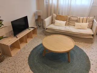 Salón completo más 2 camas - Mesa comedor de madera clara. - 6 Sillas de madera con cojines. - Mesa madera central auxiliar - Mesa madera tv pequeña - Sofá beige. - Base tapizada con colchón 190x90 - Base tapizada con colchon 190x 1.50