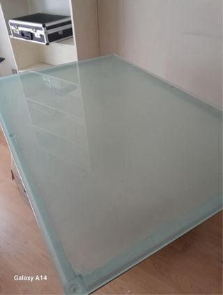 Mesa de comedor con superficie de cristal y estructura de madera. Con compartimentos debajo del cristal. Mesa baja, muy cómoda para comidas en el sofá. 60x60 ideal para comedores pequeños. Altura 48cm normal y 65cm elevada. Está usada, pero se encuentra en buen estado