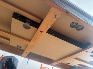 Maciza de pino. Tiene ruedas y cajones incorporados. Contiene una tabla que se puede tapizar y que encaja perfectamente con los bordes de la mesa y queda completamente fijo. Recogida en Sant cugat, a pie de calle y 3 metros de distancia de carga y descarga.