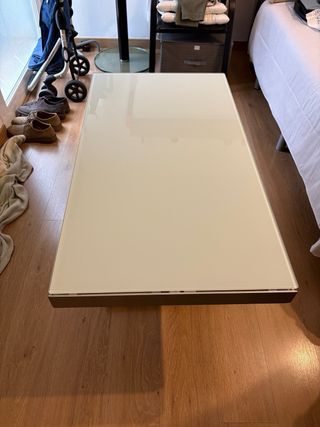 Mesa moderna con superficie de cristal y base de metal. Su diseño permite extenderla para adaptarse a tus necesidades. - Extensible en anchura. - Extensible en altura.