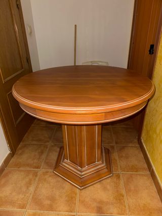 Elegante mesa de comedor redonda con base central. - Diseño extensible para mayor capacidad. - Acabado en madera con detalles en blanco. Madera buena, medidas sin extender Se vende espejo a parte para la mesa