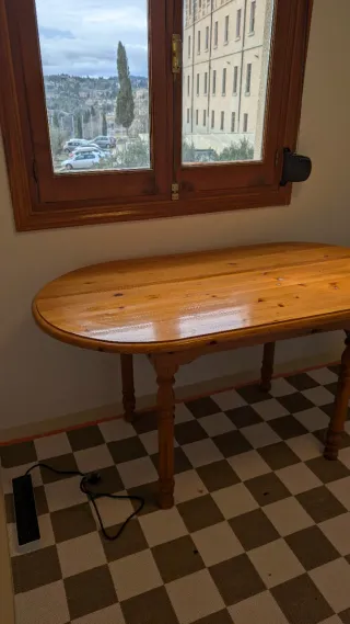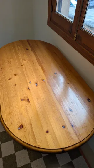 Mesa de comedor robusta y elegante, fabricada en madera de pino maciza. Alguna marca del uso pero lo normal, con una pulida se queda estupenda. - Diseño ovalado. - Patas torneadas con detalles. - Acabado natural que resalta la veta de la madera.