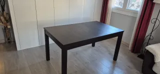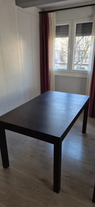 Mesa de comedor o salón extensible en acabado negro-wengué. Diseño moderno y funcional que se adapta a diferentes espacios, con estructura robusta de manera. Fácil de extender. Medidas fija: 140 largo x 84 ancho x74 alto Extensible a: 180 largo x 84 ancho x 74 alto Segunda extensión: 220 largo x 84 ancho x 74 alto Está en perfectas condiciones, casi como nueva