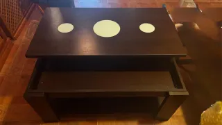 ✨ Mesa de centro elevable moderna y funcional ✨ Descripción: Vendo mesa de centro elevable en muy buen estado, ideal para salón, comedor o piso pequeño. Muy práctica para comer, trabajar con el portátil o guardar cosas gracias a su espacio interior. 📏 Medidas: Largo: 1,10 m Ancho: 55 cm Alto: 45 cm Ancho abierta: 75 cm Alto abierta: 55 cm 💡 Perfecta para salones modernos o espacios reducidos.
