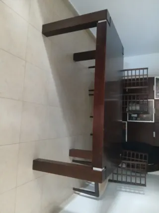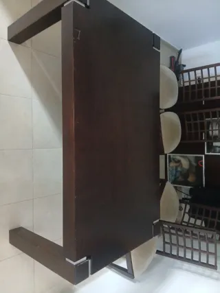 Elegante mesa de comedor con un diseño moderno y robusto. Su acabado oscuro aporta calidez a cualquier espacio. Tieme muestras de uso y algun raaguño que se pueden apreciar en la fotografia. Solo recogida. No hago envios.
