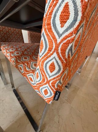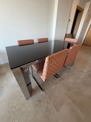 Conjunto de mesa de comedor extensible y cinco sillas con un diseño moderno. - Mesa con cristal negro. - Patas de la mesa en metal. - Sillas tapizadas en tela naranja con estampado. - Estructura de las sillas en metal. - Sistema de mesa extensible