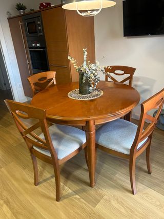 Conjunto de comedor en buen estado, compuesto por mesa extensible de madera maciza y 4 sillas a juego. La mesa es de estilo clásico, sólida y elegante, con un bonito acabado en tono cerezo / nogal claro, ideal para comedores amplios o ambientes tradicionales. 📏 Medidas: • Cerrada: 140 x 90 cm • Extendida: hasta 220 cm Perfecta tanto para el uso diario como para reuniones familiares. Se vende por cambio de mobiliario. - Mesa de comedor de madera. - Incluye 4 silla tapizadas de tela