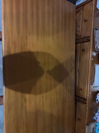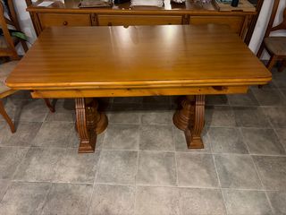 Mesa plegable de madera. Cuando está plegada mide 73cm de largo y se puede estirar hasta 2 metros. Abriendo solo un ala mide 137cm. Tiene algunos desperfectos por el uso. Está en un segundo piso sin ascensor.