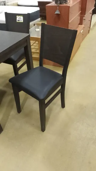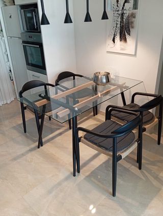 Elegante mesa de comedor con superficie de cristal y base de madera. - Diseño moderno y funcional. - Patas de madera robustas. Mesa: 150€ Sillas: 30€ x4 = 120€