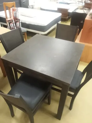 Mesa de comedor extensible robusta y elegante 90x90, perfecta para cualquier hogar con 4 sillas a juego tapizadas. - Fabricada en madera maciza. - Diseño de líneas rectas y acabado natural.