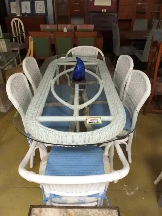 Conjunto de mesa y seis sillas de ratán, ideal para exteriores. - Mesa cubierta con mantel blanco de encaje. - Seis sillas de ratán con asientos tapizados. - Estilo rústico y elegante.