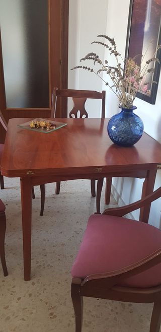 Conjunto de mesa de comedor extensible con cuatro sillas a juego. Ideal para espacios que necesitan flexibilidad. La mesa cerrada tiene 90 cm, abierta 180. La superficie está en muy buenas condiciones. Las sillas están usadas, se nota el paso de los años. La tapicería está impecable y el color es muy subrido. - Mesa con superficie de madera. - Sillas con asientos tapizados en tela.