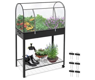 Mesa de cultivo para terraza o huerto urbano. - Estructura metálica negra. - Cubierta de PVC transparente con cremallera. - Estante inferior de rejilla. - Ruedas para fácil movilidad.