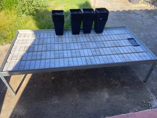 Mesa de cultivo resistente, ideal para el cuidado de plantas y flores en exteriores. - Estructura metálica. - Superficie de cultivo amplia.3 mesas de 1,33x2,83 y una mesa de 1,50 x 5 m .Las pequeñas 170e cada una y la mesa grande 300e.Para garden y viveros.