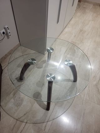 Mesa de centro ovalada de cristal y madera, en buen estado. Es una mesa elegante y práctica, ideal para cualquier salón. - Tiene una superficie de cristal transparente sobre una base de madera. - Sus patas son de metal plateado. - Perfecta para colocar encima bebidas, libros o cualquier otro objeto decorativo.