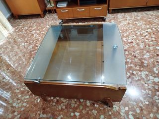 Elegante mesa de centro con una combinación de materiales que aportan calidez y modernidad. - Superficie superior de cristal. - Base y estructura de madera. - Diseño cuadrado. - Medidas 44 alto 80 por 80 el precio no es negociable solo recogida en persona