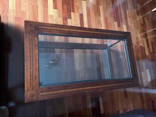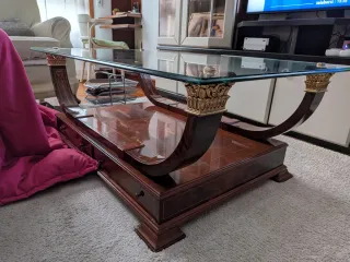 Mesa de centro con un diseño robusto y único. Está muy bonita, pero en el piso nuevo no le encontramos sitio. Envío desmontada, pero prefiero venta en mano. En la parte de abajo de las patas tiene ruedas de bola, que facilita mucho poder moverla por el espacio donde la tengas. - Estructura de madera maciza. - Superficie de cristal. - Detalles decorativos interiores.