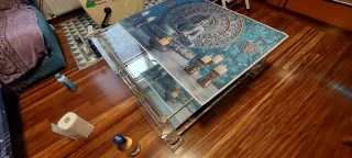 Elegante mesa de centro con superficie de cristal y base de madera. - Diseño moderno y sofisticado. - Combinación de materiales de alta calidad. El cristal está bien, lo que se ve son las protecciones para no dañarlo.