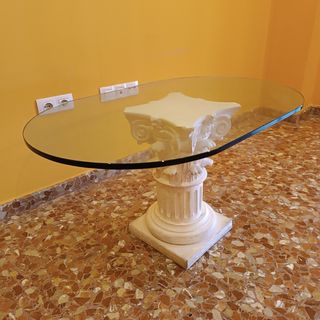 Mesa de cristal con pata de escayola trabajada. Posibilidad de mesa de comedor igual. 179'5cm ancho, 84'5cm hondo y 79,5cm de altura y con dos patas de escayola trabajadas. Mesa grande 100€. En conjunto 125€, las dos mesas. Grosor vidrio 1'5cm.