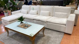 Sofá modular de gran tamaño, perfecto para salones amplios. Su diseño moderno y color neutro se adaptan a cualquier estilo de decoración. - Medidas: 350cm de largo x 165cm de chaise longue. - Tapicería de tela. - Mesa de centro con superficie de cristal.