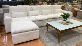 Sofá modular de gran tamaño, perfecto para salones amplios. Su diseño moderno y confortable lo convierte en el centro de atención. - Tapicería de tela en color blanco. - Estructura de metal. - Mesa de centro de cristal con base dorada.