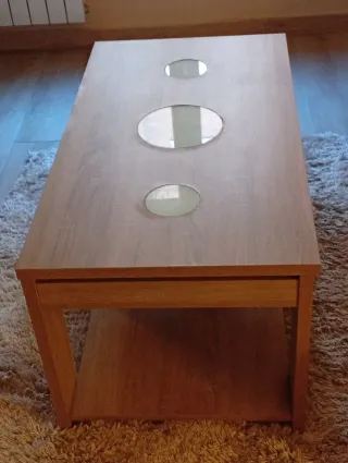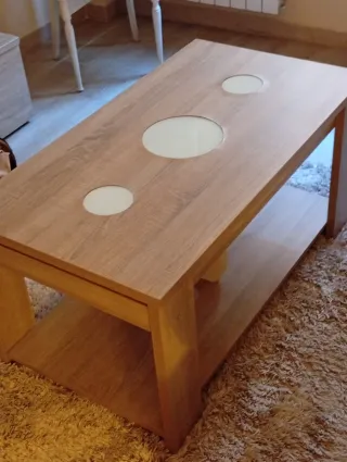 Elegante mesa de salón con un diseño moderno y funcional. Combina la calidez de la madera con la luminosidad del cristal. - Encimera con detalles circulares de cristal. - Estructura robusta de madera. - Balda inferior para almacenamiento adicional.