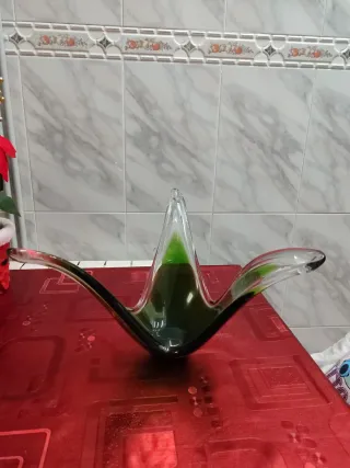 Elegante centro de mesa de cristal y llamativo. Combina tonos verdes intensos en su interior con un exterior oscuro. - Material: Cristal. - Color: Verde y negro. - Diseño: Curvo y estilizado.