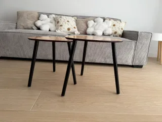 Conjunto de dos mesas de centro. Modernas y minimalistas. Acabado símil madera con patas negras. Totalmente nuevo. Sin usar. - Medidas mesa 1: 44.5 cm de diámetro x 44.5 cm de alto. - Medidas mesa 2: 41 cm de diámetro x 41 cm de alto.
