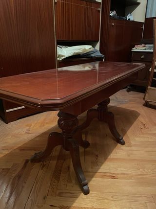 Elegante mesa baja de madera maciza con un diseño clásico. Extensible. - Acabado en tono marrón oscuro. - Patas robustas y decorativas. - Detalle de barra central. - Ideal para complementar salones.