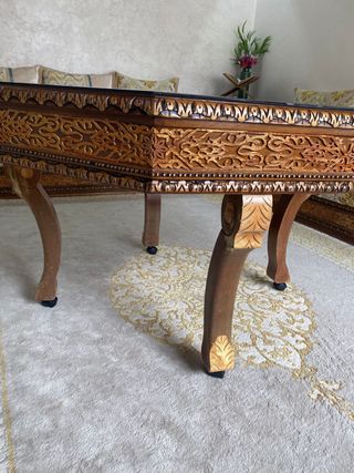 Vendo preciosa mesa de estilo colonial, importada de la India y fabricada artesanalmente en madera maciza de Sheesham (palisandro de la India). Es una pieza robusta, pesada y con una personalidad única que destaca en cualquier salón. Características principales: Material: 100% Madera de Sheesham, conocida por su extrema dureza y sus vetas naturales tan marcadas y decorativas. Detalles artesanales: Laterales decorados con celosía de forja negra, un detalle típico del mobiliario tradicional indio que le da un toque elegante y exótico. Dimensiones: 1,60x0,80 m