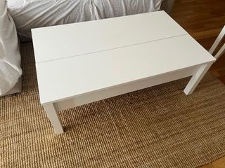 Vendo mesa de centro blanca en buen estado. La parte superior es elevable, ideal para comer, trabajar con el portátil o usar cómodamente desde el sofá. Además, tiene cajón de almacenaje interior, perfecto para guardar mandos, revistas o mantas y mantener el salón ordenado. Diseño moderno y funcional que combina con cualquier salón. Características: • Color blanco • Tapa elevable • Compartimento de almacenaje • Muy práctica y cómoda • Tres cristales superiores color negro • Medidas: 96x50cm • Altura: 41cm (cerrada), 55cm (abierta) Se vende por cambio de mobiliario en el salón.