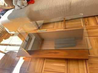 Elegante mesa de centro con superficie de cristal y estructura de madera. - Diseño moderno y funcional. - Combina cristal y madera para un acabado sofisticado. - Ideal para dar un toque de estilo a tu salón.