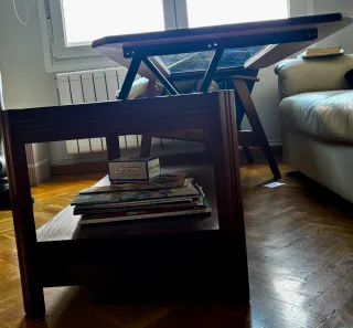 Mesa de centro de madera con estructura metálica negra. Cuenta con tablero elevable, ideal para usar el portátil, comer o trabajar cómodamente desde el sofá. Incluye cajón lateral que se abre por ambos lados y compartimento interior amplio para guardar mandos, cables, documentos u otros objetos. Es una mesa muy práctica y funcional, perfecta para mantener el salón organizado y aprovechar el espacio. La vendemos por mudanza. Como detalle, uno de los soportes de la mesa tiene un pequeño desgaste por mordida de perro. Es un detalle únicamente estético y se puede arreglar fácilmente (lijando o con un pequeño retoque).