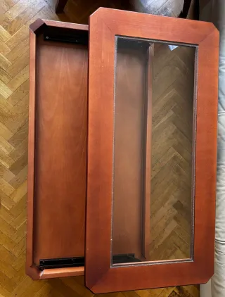 Elegante mesa baja para el salón con un diseño moderno. Se puede subir la tabla para comer. Y tiene un cajón. Está bien conservada pero muy usada también. - Combinación de madera y cristal. - Tonos marrones y transparentes.