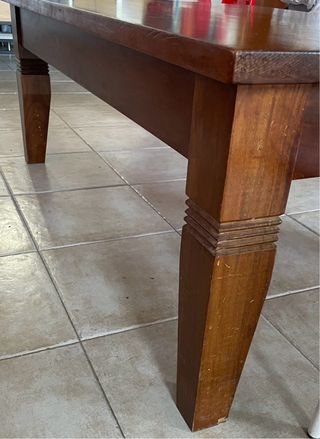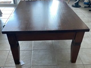 Mesa de centro de madera con un diseño robusto y elegante, perfecta para complementar tu salón. Madera maciza. URGE SU VENTA. Precio negociable. - Patas gruesas y estables. - Tablero con acabado pulido. - Bordes redondeados.