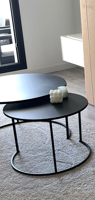 Conjunto de tres mesas auxiliares redondas de madera, perfectas para complementar tu salón o dormitorio. Su diseño apilable permite ahorrar espacio. - Acabado en color negro. - Patas de madera clara.