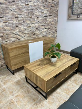 Conjunto de salón con mesa de centro y mueble para TV, ambos con un diseño moderno y funcional. - Mesa de centro con cajones y patas metálicas. - Mueble bajo TV con puerta blanca y acabado en madera. 📲 Llama ahora: 643*189*083 💸Pagas al recibir 🚚💨 Envíos disponibles 🛠️ Montaje disponible 🏡⬆️ Te lo subimos hasta tu casa Compra segura, rápida y sin complicaciones. ¡Aprovecha antes de que se agote!