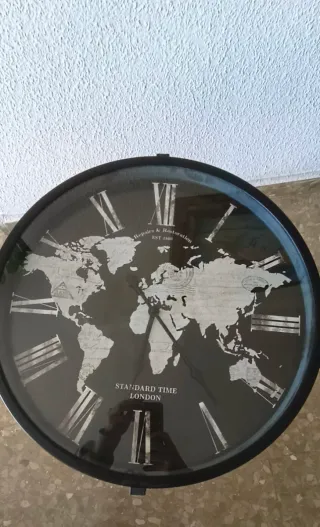 Mesa baja y original de centro o auxiliar para salón, de metal y cristal. Prácticamente nueva, y funciona además como reloj que marca la hora. Necesita 1 pila AA ( incluida). Medidas de la mesa: - Altura: 51 cm - Diámetro esfera: 48 cm - Profundidad: 50 cm Lo entrego embalado si el comprador lo quiere así. Apenas pesa, muy ligero.