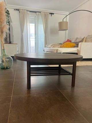 Mesa de centro grande 90x90 cm, diseño elegante de líneas limpias estilo mid-century. Acabado en madera oscura tipo wengué, con patas metálicas y estante inferior doble perfecto para libros, revistas o decoración. Muy estable y con mucha presencia en el salón. Buen estado con pequeñas marcas de uso. Es bastante pesada, tenerlo en cuenta para el transporte. Solo recogida en Gran Vía Germanías