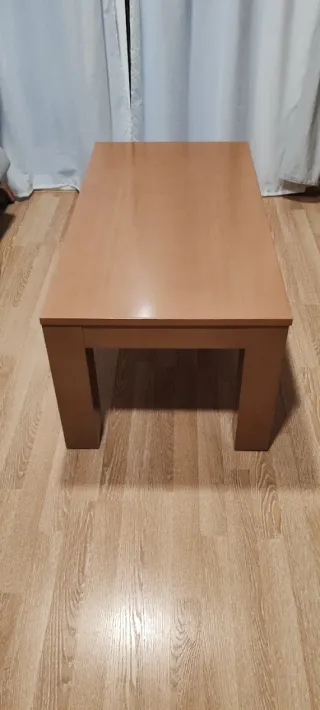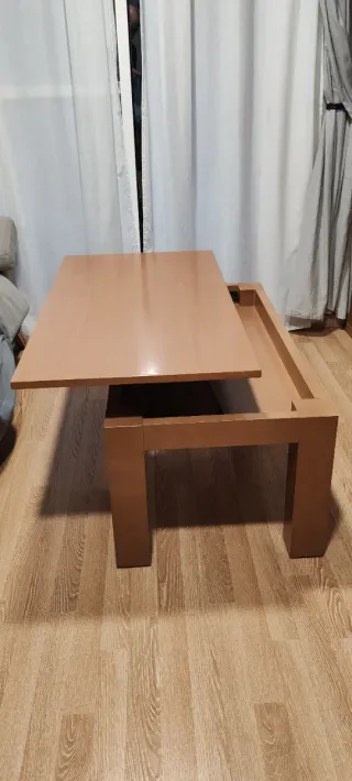 Mesa de centro elevable. Se levanta y se abre para convertirse en mesa de comedor para 6 personas cómodamente. ✔ Madera resistente ✔ Sistema de apertura muy cómodo ✔ Ocupa poco espacio cerrada ✔ Ideal para salones pequeños o pisos Madera de buena calidad. Medidas abierta 140x105x72 alto