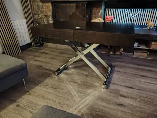 Elegante mesa de centro con un diseño moderno y funcional. - Acabado en madera oscura. - Estructura robusta y estable. - Diseño con balda inferior para almacenamiento adicional. - Se eleva para poder comer en el sillon!!!