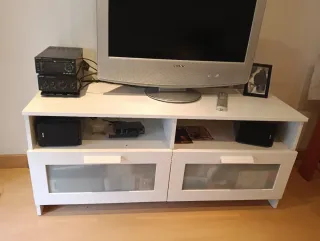 Set de muebles con diseño industrial, combina una superficie de madera con una estructura metálica. - Tablero de madera. - Estante inferior de rejilla metálica. - Patas metálicas negras. Consta de: Librería: 136Alto, 51Ancho, 36Fondo. El espacio entre estanterías es de 39cm Mesa de centro: 47Alto, 90Ancho, 45Fondo Mesa de televisión: 54Alto, 150Ancho, 36Fondo Mueble FJÄLLBO de ikea, precio origial 267eur.