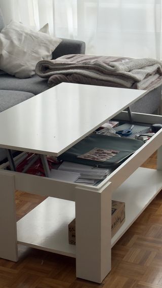 Mesa de centro con diseño moderno y funcional. - Superficie elevable. - Compartimento interior de almacenamiento. - Una de las patas se ha separado, pero se puede pegar o atornillar