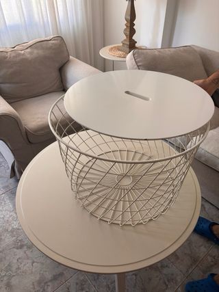 Preciosa mesa auxiliar de metal, ideal para cualquier estancia. Es blanca y tiene un diseño elegante y ligero. - Perfecta como mesita de café o auxiliar. - Se compone de una cesta metálica y una tapa redonda. - Diseño moderno y minimalista.