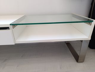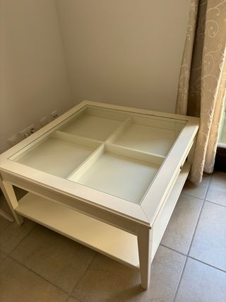 Mesa de centro de Ikea, un modelo descatalogado. Es de color blanco y tiene un diseño elegante y atemporal. - Tiene una tapa de cristal. - Dispone de un estante inferior para almacenamiento. - Se encuentra en buen estado. El precio original eran 220€ precio negociable
